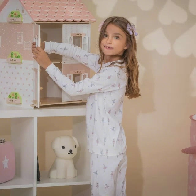 Απογειώστε τη βραδινή φαντασία με το σετ πιτζάμας "Μπαλαρίνα" για κορίτσια. Με μαγευτικά σχέδια μπαλαρίνων, αυτή η παιδική πιτζάμα συνδυάζει άνεση και όνειρα, χαρίζοντας σε κάθε μικρή μια ξεχωριστή εμπειρία ύπνου γεμάτη χορό και φαντασία.